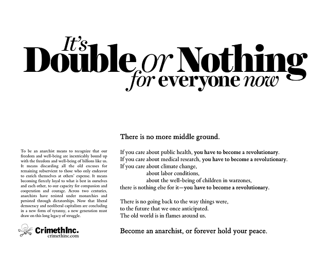 To be an anarchist means to recognize that our freedom and well-being are inextricably bound up with the freedom and well-being of billions like us. It means discarding all the old excuses for remaining subservient to those who only endeavor to enrich themselves at others’ expense. It means becoming fiercely loyal to what is best in ourselves and each other, to our capacity for compassion and cooperation and courage. Across two centuries, anarchists have resisted under monarchies and persisted through dictatorships. Now that liberal democracy and neoliberal capitalism are concluding in a new form of tyranny, a new generation must draw on this long legacy of struggle.