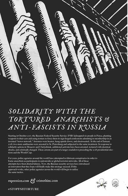 Starting in October 2017, the Russian Federal Security Service (FSB) kidnapped six people in Penza, planting weapons in their cars and using torture to force them to sign forged confessions admitting to membership in an invented “terror network.” Arrestees were beaten, hung upside down, and electrocuted. At the end of January 2018, two more antifascists were arrest in St. Petersburg and subjected to the same treatment. In response to solidarity actions in Moscow and Chelyabinsk, additional activists have been arrested, tortured with electrical shocks, and criminally charged. These arrests are part of a larger crackdown proceeding the 2018 presidential elections and the World Cup.